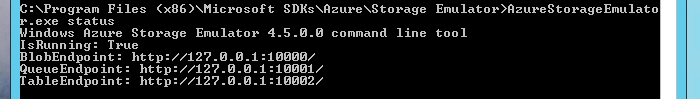 Once everything is installed you can start the storage emulator by searching for it from the start screen. It should open up a new cmd window. You can then verify that it is running: