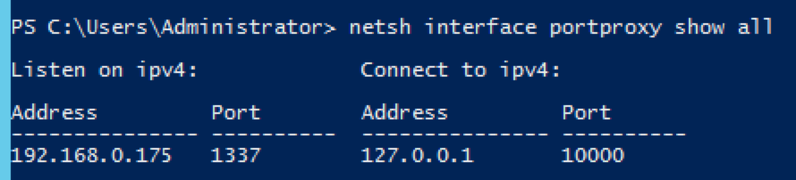 netsh 1337 127.0.0.1 10000You can verify the result of the command:
